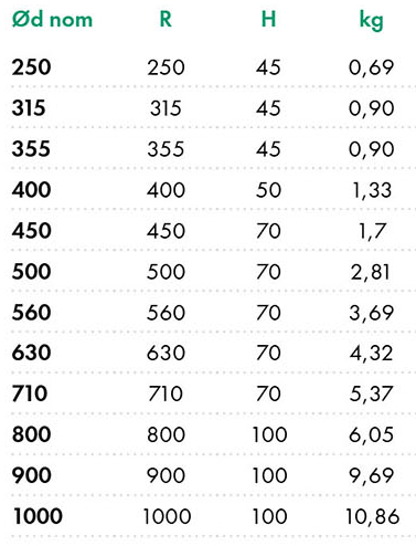 Below are the standard sizes for 15° segmented bends. Pressed bends (diameter up to 200 mm) are a separate product.
