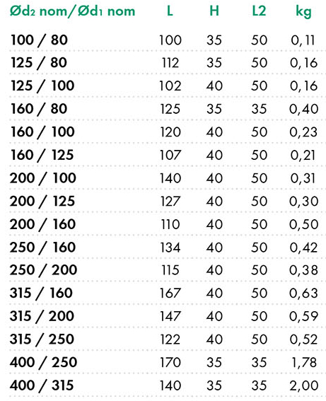 Thanks to its streamlined shape, the pressed reducer creates minimal aerodynamic resistance and reduces noise in the system. The presence of factory-installed EPDM rubber gaskets on both sides guarantees high airtightness class "D".